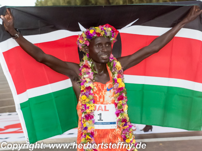 Copyright: Herbert Steffny) | Der Champ und das Model - Aloha Feeling für Lawrence Cherono im Ziel. (Foto, Copyright: Herbert Steffny) |