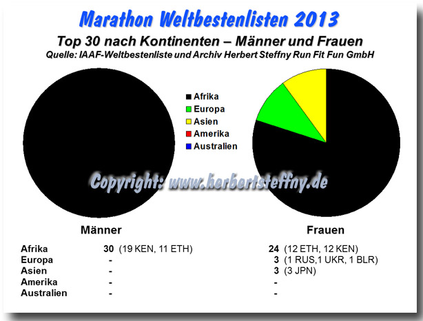 Bei den Damen brillierten in diesem Jahr die beiden Kenianerinnen Edna Kiplagat, die ihren Weltmeistertitel in Moskau erfolgreich verteidigen konnte und die überragende Priscah Jeptoo, die ihrem Sieg in London den Titel in New York folgen lassen konnte. Zudem sicherte sie sich den World Marathon Majors Jackpot der Serie 2012/2013 mit 500.000 Dollar. Schnellste des Jahres war aber die nicht verwandte Landsfrau Rita Jeptoo, die In Chicago mit 2:19:57 Stunden als einzige in diesem Jahr die 2:20 Stunden Grenze unterbieten konnte. Auch bei den Damen dominieren die Afrikanerinnen zunehmend die Weltbestenliste. Unter den Top-30 sind nun je 12 Äthiopierinnen und Kenianerinnen, 3 Japanerinnen, eine Weißrussin, eine Ukrainerin und die Russin Mariya Konovalova, die mit 2:22:46 Stunden als Chicago Dritte und Platz neun der Weltbestenliste am weitesten in die Phalanx der Afrikanerinnen eindringen konnte (siehe auch Grafik 2).