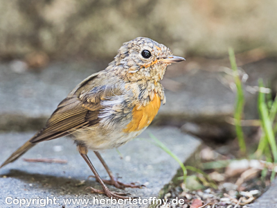 Dasselbe junge Rotkehlchen im August hatte noch keine namensgebende Färbung.