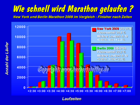 Die nachfolgende Grafik vergleicht die Finisherzeiten und einige andere Daten zwischen dem New York und Berlin Marathon im Jahre 2009. Die mittlere Laufzeit (50% im Ziel) ist in Berlin mit 4:10 Stunden etwas schneller als in New York (4:19 Stunden). In Berlin war es zwar etwas wärmer, dafür ist die Strecke deutlich schneller und flacher. Der höhere Frauenanteil (34,8%) in New York im Vergleich zu Berlin (20,2%) senkt ebenfalls die Durchschnittszeit in der amerikanischen Metropole. Auffallend ist die deutlich höhere Zahl der langsamen Läufer/Walker in New York, während Berlin trotz 8.359 weniger Finishern im Bereich unter 3:30 Stunden und schneller sogar absolut mehr Läufer zu verzeichnen hat. Der Anteil der Finisher unter 3:00 Stunden ist in der Bundeshauptstadt mit 3,3 Prozent deutlich höher als in New York (2,3%), aber deutlich niedriger als in der 80er Jahren, als ein Viertel aller Läufer unter der 3:00 Stundengrenze blieb. Gründe für diesen Rückgang der Leistungen im Elitebereich mit einem detaillierteren Vergleich finden Sie hier.